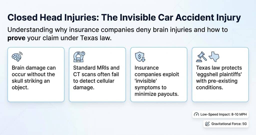 Of all the injuries I see in my Houston personal injury practice, none are more misunderstood—or more systematically undervalued—than closed head injuries. These invisible injuries don’t show up on standard X-rays. They don’t leave visible scars. And because the human brain is extraordinarily complex, their symptoms can be maddeningly difficult to explain to insurance adjusters, defense attorneys, and juries who have never experienced them.