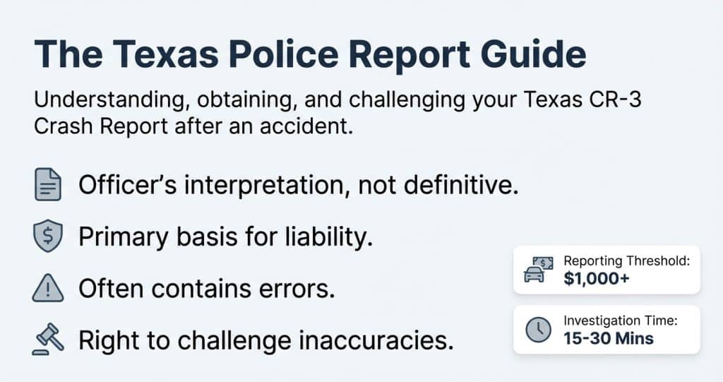 Understanding what the police report actually is—and what it isn’t—helps you use it effectively when it supports your case while challenging inaccuracies when it doesn’t. This guide explains the anatomy of a Texas police report, how to obtain yours, how to read it critically, and what to do when the report gets things wrong.